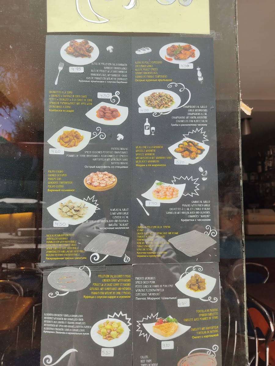 Food offerings include traditional Spanish dishes, confirmed by customer feedback referencing paella and fideuà, as well as options like pizza, bravas, and spicy wings. These items suggest a menu that incorporates both local specialties and popular snack or tapas-style dishes.